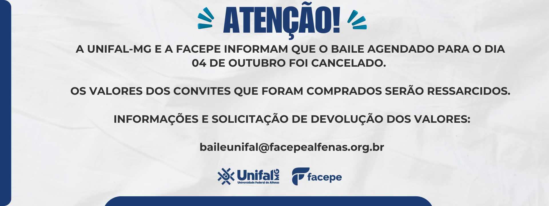 Informamos, por meio deste, que a data do Baile Comemorativo pelos 20 anos da Universidade Federal de Alfenas (UNIFAL-MG) foi alterada para o dia 4 de outubro de 2025, por decisão da vice-reitoria da Unifal e da Diretoria de Comunicação.